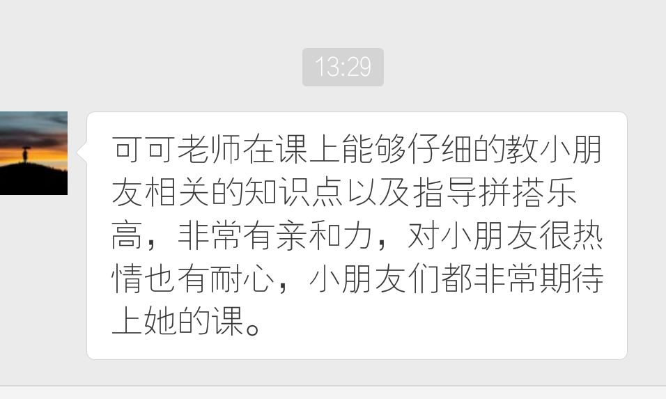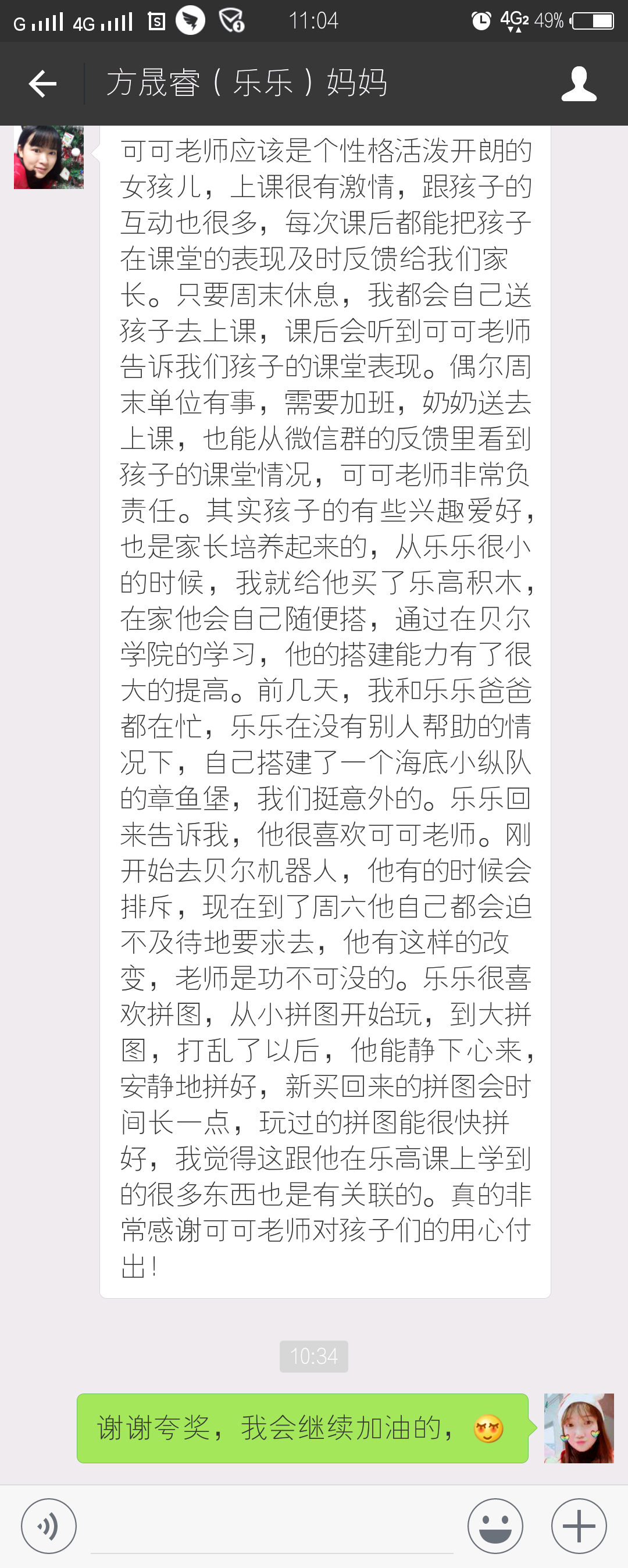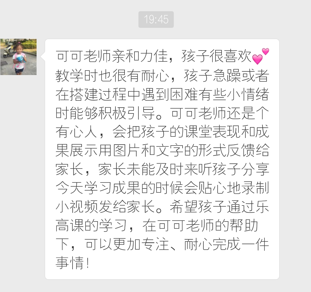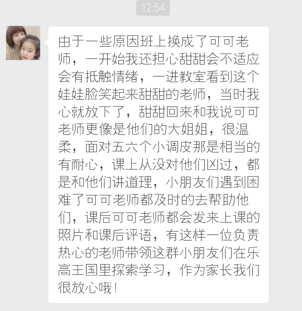 可可老师应该是个性格活泼开朗的女孩儿,上课很有激情,跟孩子的互动也很多,每次课后都能把孩子在课堂的表现及时反馈给我们家长。只要周末休息,我都会自己送孩子去上课,课后会听到可可老师告诉我们孩子的课堂表现。偶尔周末单位有事,需要加班,奶奶送去上课,也能从微信群的反馈离看到孩子的课堂情况,可可老师非常负责任。其实孩子的有些兴趣爱好,也是家长培养起来的,从乐乐很小的时候,我就给他买了乐高积木,在家他会自己随便搭,通过在贝尔学院的学习,他的搭建能力有了很大的提高。前几天,我和乐乐爸爸都在忙,乐乐在没有别人帮助的情况下,自己搭建了一个海底小纵队的章鱼堡,我们挺意外的。乐乐回来告诉我,他很喜欢可可老师。刚开始去贝尔机器人,他有的时候会排斥,现在到了周六他自己都会迫不及待地要求去,他有这样的改变,老师是功不可没的。乐乐很喜欢拼图,从小拼图开始玩,到大拼图,打乱了以后,他能静下心来,安静地拼好,新买回来的拼图会时间长一点,玩过的拼图能很快拼好,我觉得这跟他在乐高课上学到的很多东西也是有关联的。真的非常感谢可可老师对孩子们的用心付出!